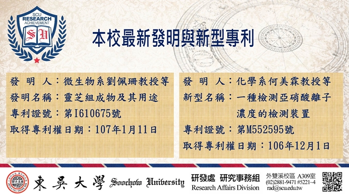本校最新獲得發明專利1件及新型專利1件,分別是微生物系劉佩珊教授及化學系何美霖教授因執行科技部計畫所衍生之研究成果,分述如下: