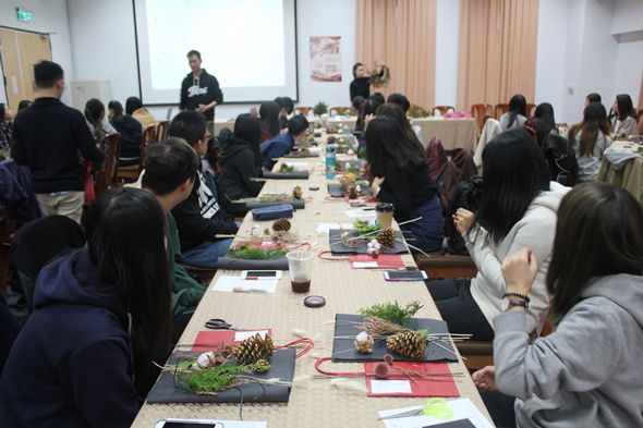 通識教育中心舉行的講座活動多半是聽講形式,鮮少有手做課程,這次特別為同學帶來不一樣的學習體驗,也因為活動報名踴躍,在城中校區又額外加開一場乾燥花製作。每位參與活動的同學都能擁有一組製作材料,有毬果、雪花、新鮮楠柏、木棉花、兔尾草等精緻花材。阿戴老師以投影片輔助細心講解教學,並且親自到同學身旁進行示範,讓大家都能成功完成作品。最後,參與的同學們還能選擇一款喜歡的緞帶,為花束繫上,帶走一個下午浪漫的證明。