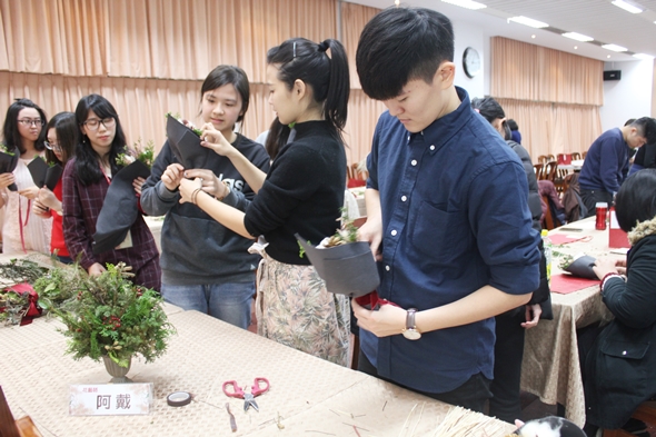活動進行搭配播放著聖誕氣息濃厚的音樂,有美麗的花材、溫暖的黃燈、舒適的長桌空間,讓同學們度過美好的午後,場面十分溫馨歡樂。另外,同學們只要將自己的成果拍照打卡標記阿戴商號,還能參與抽獎獲得製作聖誕花籃的免費名額。