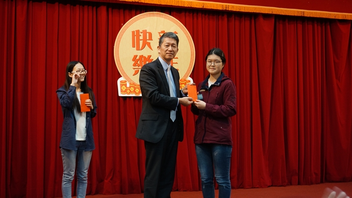 本次活動除了祭祖與聚餐,本校及教育部、僑委會還為境外生們準備了豐富的獎品及獎金。在同學們的翹首期盼中,各位貴賓與師長從「財神」手中抽出上百份幸運紅包,將全場氣氛一次次推向高潮。此外,胡國際長為國際處志工們頒發證書,感謝他們本學期為國際處的付出,他們是推動東吳國際交流不可或缺的一支力量。