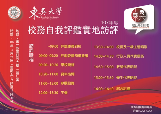在接受高教評鑑中心評鑑前,本校訂於107年3月23日(星期五)先行辦理「東吳大學107年度校務自我評鑑實地訪評」,共聘請10位校外專家學者蒞校進行實地訪評。實地訪評行程中包含老師、學生及行政人員晤談,將由評鑑委員召集人預為勾選,屆時將另行通知備選中之老師、學生及行政人員。(晤談老師、學生及行政人員之注意事項,請參考附件說明。)