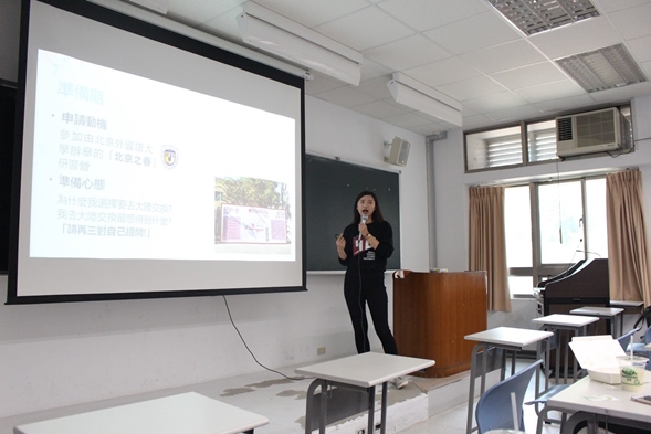 「交換前必須知道你想要的是什麼」日文系的林佑蓁同學表示,因為曾經參加過北京外語大學「北京之春」的營隊,不想放棄到優質大陸大學交換的機會,於是她展開一學期在北京外語大學的交換生活。她將短且可貴的交換期間主要分為學習、交友、旅遊等,上課日在圖書館做好預習與複習,周末把握機會與交換生或當地學生交流,規律的生活也讓交換期間的學習效率有所提升,又不失乏味。