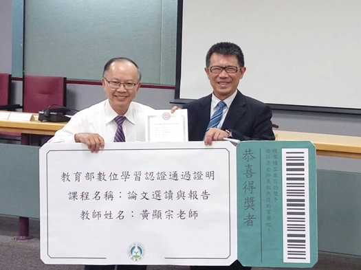 在106年度第2梯次數位學習課程認證中,本校微生物學系黃顯宗老師開設之「論文選讀與報告」遠距教學課程,順利通過,成為教育部認證的數位學習課程之一,是本校第二門通過教育部數位學習課程認證的課程,第一門通過的課程為103年度第2梯次師培中心賴光真老師「教育哲學」。