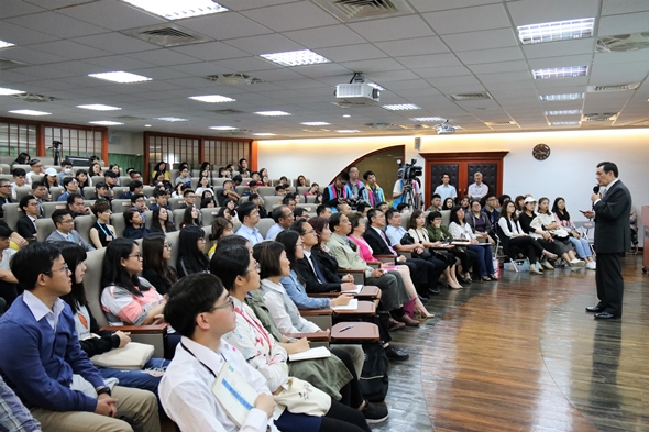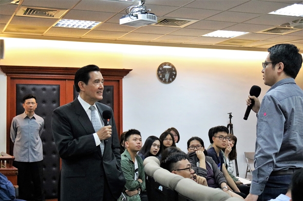 本校自105學年度起禮聘前總統馬英九先生以榮譽無給職方式擔任「嚴家淦法學講座教授」,以每月1場不同主題的演講課程,與同學互動對談。本次馬英九講座教授本學期的第3場演講以「從兩韓到兩岸:東亞分裂國家統合的新模式?」為題,於5月9日上午在本校城中校區崇基樓實習法庭開講,校內師生報名踴躍熱情參與,現場座無虛席。