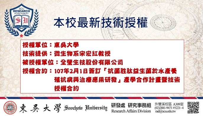 今(107)年2月本校微生物系宋宏紅教授與全瑩生技股份有限公司以產學合作方式進行「抗菌胜肽益生菌於水產養殖抗病與治療應用之研發計畫」,並以科技部計畫所衍生之兩項研究成果-「具有脂多醣結合活性之胜肽(發明專利第I448472號)」及「抗菌胜肽及其在蝦類的應用(營業秘密)」進行技術授權,成為本校首件以既有研發技術進行專屬授權案,為本校教師研發成果運用推向新的里程碑。