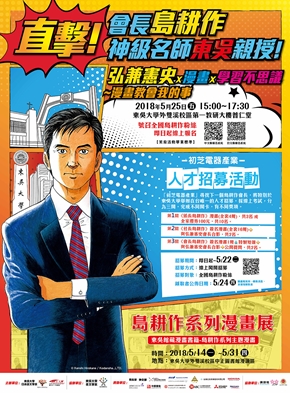 承蒙中文系校友周衡學長將珍藏數十年近一萬冊的漫畫慷慨捐贈,本校於2014年在中正圖書館四樓增設「漫讀區」,積極蒐羅各國漫畫、推廣漫畫閱讀與交流,希望漫畫不僅僅是休閒娛樂的媒介,也可以成為學習研究的文本。本次為探討動漫畫文化風靡全世界的奧秘及展望動漫畫文化的前景,圖書館、日文系與渥美國際交流財團關口全球研究會(SGRA)很榮幸地邀請到日本神級名師漫畫家《島耕作》系列作者弘兼憲史老師於5月25日(五)下午3點在本校外雙溪校區普仁堂以「弘兼憲史x漫畫x學習不思議~漫畫教會我的事(日文題目:漫画から学んできたこと)」為題,分享其漫畫創作的心得,且演講現場將有逐步口譯,並可認證美育活動畢業標準,機會千載難逢不可錯過。