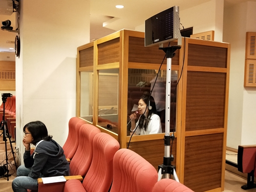 台上講者滔滔不絕地演講,後方口譯室的同學們聚精會神的進行同步的中英翻譯,透過連線傳到在場觀眾的耳機頻道。參與翻譯的英四C周立傑同學分享,練習同步口譯的過程。他說,ㄧ開始會跟不上速度,藉著大量練習文章和影片翻譯,逐漸找到自己的節奏。其中,最具挑戰的是笑話翻譯,因為東西方文化的不同,有時在語言轉換便會失去原有的幽默。英四C林佳蓁同學則表示,臨場反應很重要,在有限的時間內,若要將稿上沒有的單詞或成語傳達到位,必須趕緊用自己的方式換句話說,準確傳達講者要表達的概念。平時多練習英語聽力及口說,在中英表達上練習更有彈性的轉換,到現場翻譯時才能處變不驚。