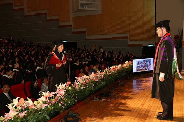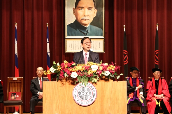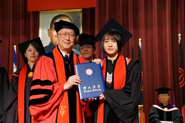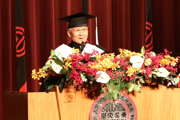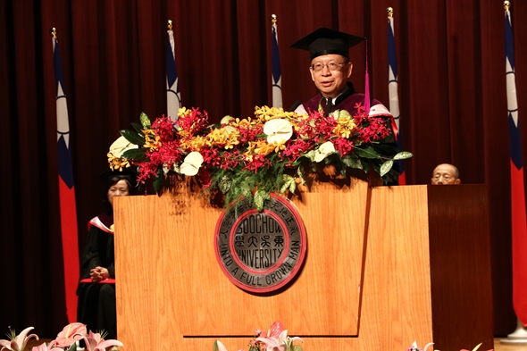 「法律可能讓公平正義得以實踐,也可能讓人身敗名裂。」潘維大校長將這句話送給畢業生,勉勵同學們即使將來掌握了權柄,要分辨是非黑白以外,也別忘記保有一顆關懷慈悲的心。此外,潘校長亦表示,同學們畢業後仍應掌握時事變化趨勢,與時俱進才是不變之道。