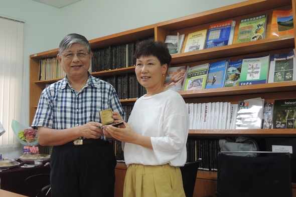 餐會開始,由微生物學系張怡塘系主任代表感謝宋老師對學系多年的付出,並祝福宋老師退休之後有個多采多姿的愉快生活!曾惠中老師回憶起當初與鍾金湯主任、宋老師,三個人三張桌子的創系初期情景,接著一路看著宋老師從助教、講師、副教授升等為教授,之後更擔任系主任及理學院院長,非常欣慰。曾老師也表示,宋老師無論在教學、研究、輔導及行政等各方面都持續不斷努力,對學系貢獻良多,對宋老師有道不盡的肯定與讚美,如今要退休了是相當不捨。溫馨的話語,讓一旁的宋老師聽了忍不住紅了眼眶,曾老師也代表系上致贈宋老師紀念金章,並由微生物學系「四美」路光予、張碧芬、劉佩珊及應靜雯四位美麗的女老師代表學系獻花祝福並與宋老師深情相擁。