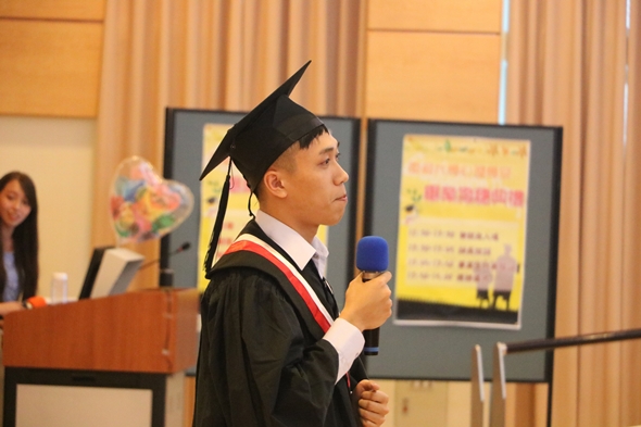 畢業生代表鄭孟杰感謝父母的陪伴支持與無私的付出;感謝身旁的朋友,一起挑燈夜戰、揮灑熱血跑營隊、生活陪伴;感謝每一位師長四年的指導、關懷與幫助。