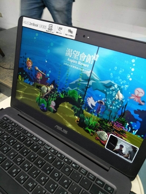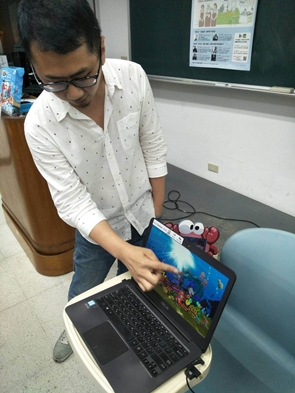 最後,說到最拿手的遊戲領域,楊老師帶來自家研發的遊戲讓大家實際體驗AR與VR的樂趣,透過電腦掃描,將自己所畫的圖案轉換為在水族箱裡優游自在的魚,而帶上眼罩更可以暢遊海洋。種種遊戲項目讓大家愛不釋手,他也笑著說到,有時搶著玩遊戲的還不是小孩,反而是大人。