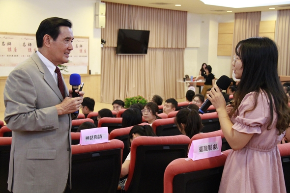 馬講座教授從兩岸的關係的歷史開始談起,他特別提及2015年11月在新加坡舉辦的馬習會,雙方再度肯定「九二共識」是兩岸共同的政治基礎,指出兩岸需要透過不同層面的交流,來建立和平,重申「戰爭沒有贏家,和平沒有輸家」的理念。他也跟同學分享小秘密,馬習會當日,他與習近平先生兩人握手長達81秒,被虧「怎麼握那麼久?」,但他解釋,其實是為了讓現場上百家媒體都能拍到各個角度握手照片的緣故。