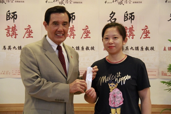 東吳大學為感謝馬講座教授,特別由本校陸生音樂碩士班黃藝妙同學代表獻花,而國際處致贈溪城講堂專屬背包、東吳連帽T恤、校景對杯,馬講座教授也回贈同學其親自書寫的書籤,上面寫著馬家家訓「黃金非寶書為寶,萬事皆空善不空」,提醒同學讀書行善的重要。
