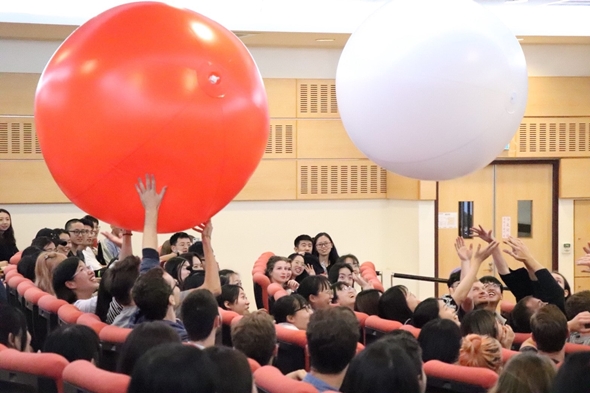 接著,由國際處志工們帶來精彩的「嫦娥奔月」短劇,讓在場的交換生們都目不轉睛,相當精采。最後壓軸的滾大球活動,更是將現場氣氛炒到的最高點,為他們的東吳交換之旅留下難忘印象。