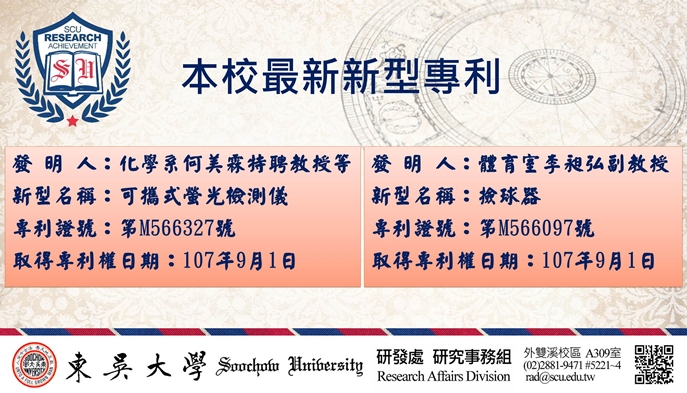 本校最新獲得新型專利兩件,分別是化學系何美霖特聘教授因執行科技部計畫所衍生之研究成果及體育室李昶弘副教授自行研發成果,分述如下: