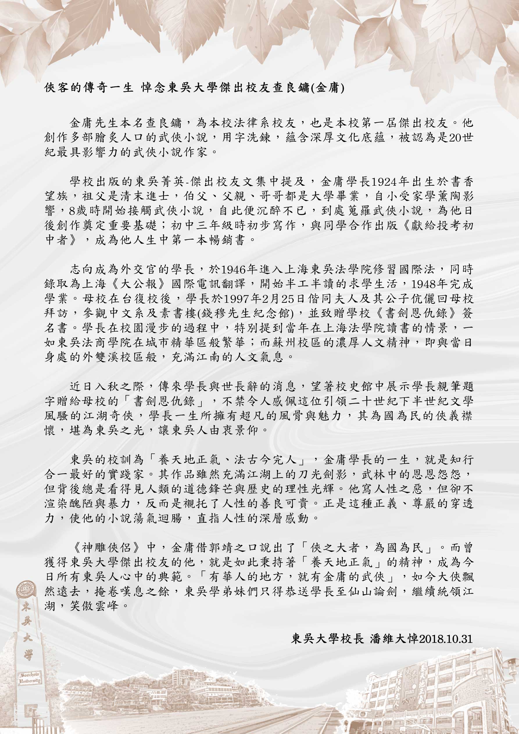 俠客的傳奇一生 悼念東吳大學傑出校友查良鏞(金庸)