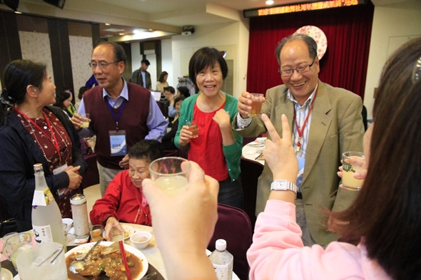 台東校友會呂信雄會長(企管系67級)特別於台東丸八餐廳宴請來訪的東吳校友;席間,廖婞君學姊(商進系100級)帶來了自己最喜愛的柚子酒與白桃酒與大家分享;弦誦合唱團、新竹校友會也特別登上舞台,為眾人獻唱,場面溫馨又和樂。