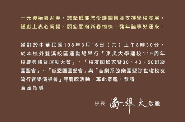 東吳大學建校119周年校慶,將於2019年3月16日在外雙溪校區舉行。為凝聚廣大校友的向心力,同時感恩過去一年為東吳付出心力的貴賓師長們,將於校慶當日上午舉辦「校友總會聯合繞場」、「校友回娘家暨30、40、50班級團圓會」、「校友全能挑戰賽、校友組大隊接力」、「感恩團圓餐會」、「音樂系弦樂團與涂世瓊校友流行音樂演唱會」等系列活動,共同感恩捐款人、廣大校友、師長與校慶貴賓們對本校的支持愛護與無私貢獻。